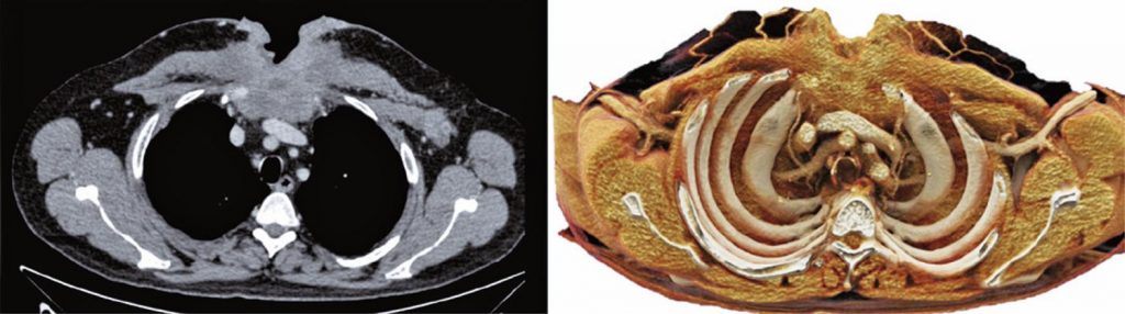 A tomografia computadorizada com os múltiplos detectores e o avanço dos processadores melhoraram as imagens renderizadas e as reconstruções tridimensionais na prática clínica. Os cortes axiais tradicionais formam imagens não intuitivas, pois são vistas em apenas um plano. Já as reconstruções tridimensionais podem exibir detalhes anatômicos em diferentes perspectivas das estruturas e de doenças com anatomia complexa. A renderização cinematográfica é uma técnica de reconstrução tridimensional recentemente introduzida, já aprovada para uso clínico, que pode produzir imagens realistas a partir de dados tradicionais da tomografia computadorizada. O algoritmo usado é baseado em métodos de trajetória da luz e no modelo de iluminação global, os quais simulam milhares de imagens de todas as direções possíveis. Assim, a técnica molda a propagação física da luz e gera uma imagem tridimensional realista, com profundidade, sombras e mais detalhes da alteração anatômica. É uma renderização multidimensional adquirida por efeitos de iluminação complexos. O objetivo deste artigo foi mostrar o avanço da tecnologia tridimensional com a renderização cinematográfica nos dos exames de imagens da parede torácica.