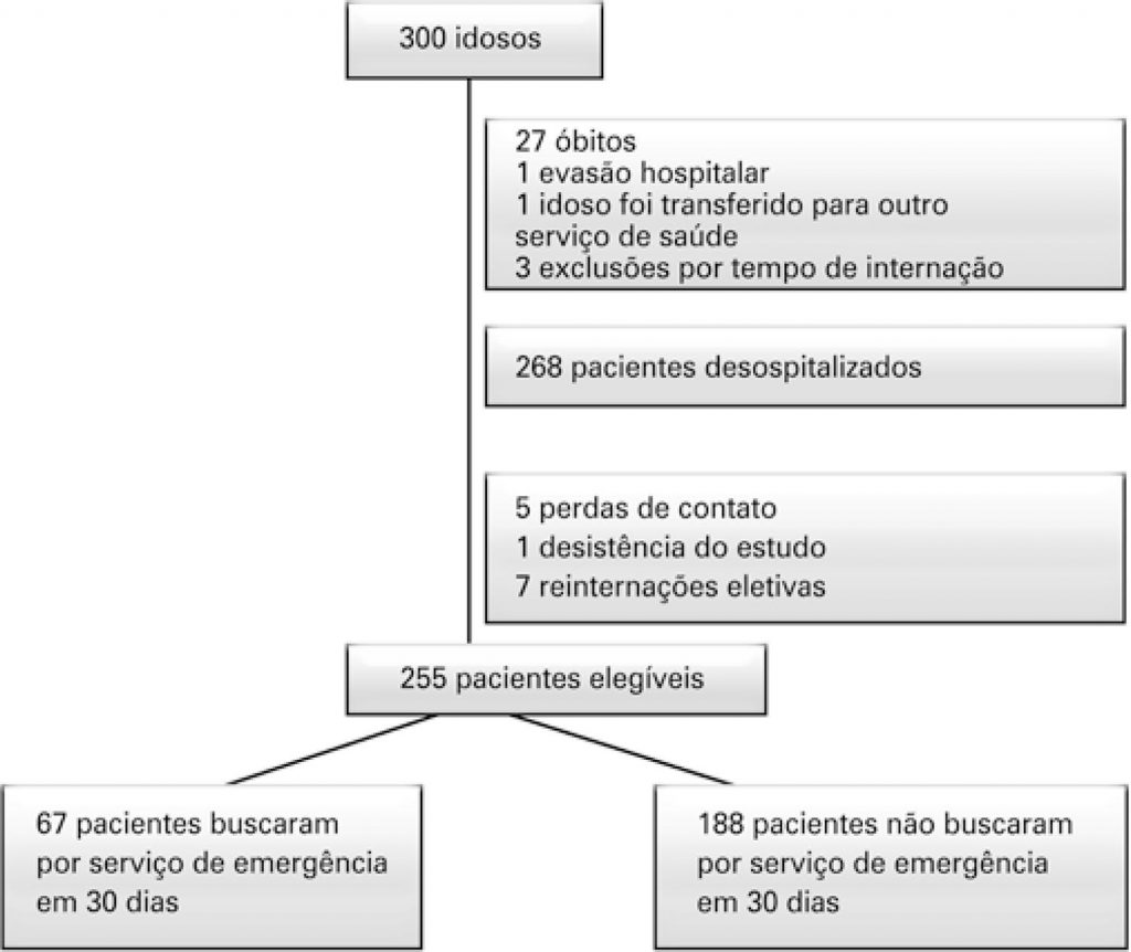 No estudo, foram incluídos 255 idosos; 67 (26,3%) visitaram departamento emergência em 30 dias após a alta hospitalar. Polifarmácia e medicamentos potencialmente inapropriados para idosos não apresentaram associação estatística significante. O diagnóstico de insuficiência cardíaca e o índice da complexidade da farmacoterapia >16,5 apresentaram associação positiva com visita a departamento de emergência (RC=2,3; IC95%: 1,04-4,94; p=0,048; e RC=2,1; IC95%: 1,11-4,02; p=0,011), respectivamente. Ainda, o diagnóstico de diabetes mellitus e a doença renal crônica foram fatores de proteção para o desfecho (RC=0,4; IC95%: 0,20-0,73; p=0,004; e RC=0,3; IC95%: 0,13-0,86; p=0,023).
